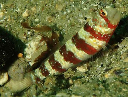 The Burgundy Shrimp Goby, otherwise known as the Redbarred Shrimp goby, is a tropical fish that reaches a size of 8 cm and is located through the Indo-west Pacific, primarily on the Tropical Australian seas. They are classified by their multiple red stripes with spots of blue scattered throughout their body.