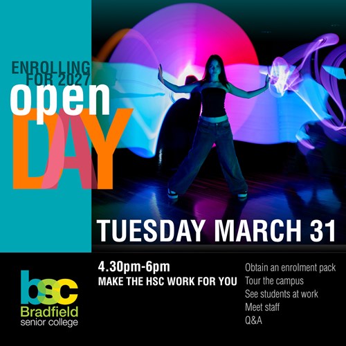 Check out our Open Day in late March. Students come to Bradfield to do the subject combinations they can't do anywhere else. Getting in early ensure you'll get the subjects you want.